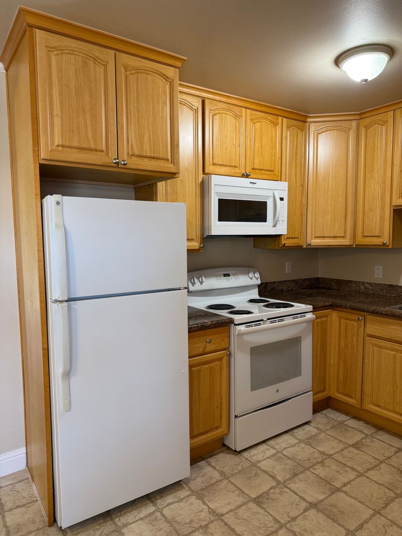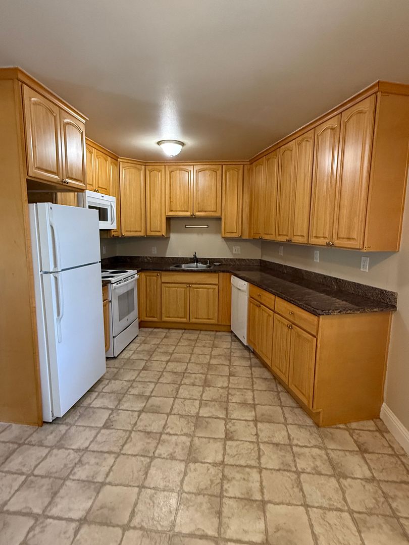 Kitchen complete with granite counter tops, great amount of cabinets, electric stove, dishwasher, refrigerator and built in microwave