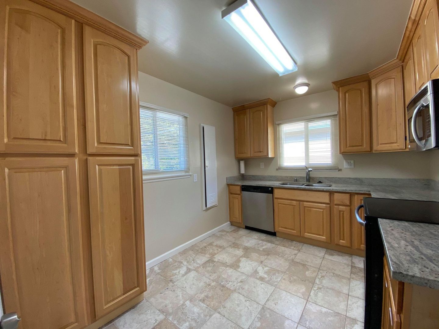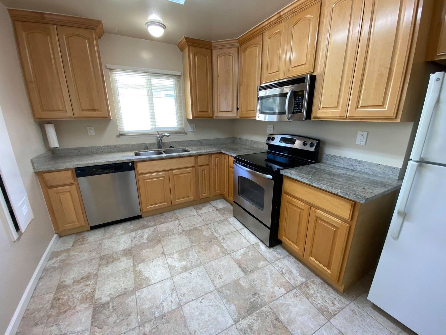 Kitchen includes electric stove, microwave, refrigerator, and granite counter tops