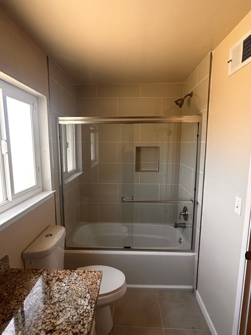 Upstairs bathroom features tile floors and new shower surround and bathtub