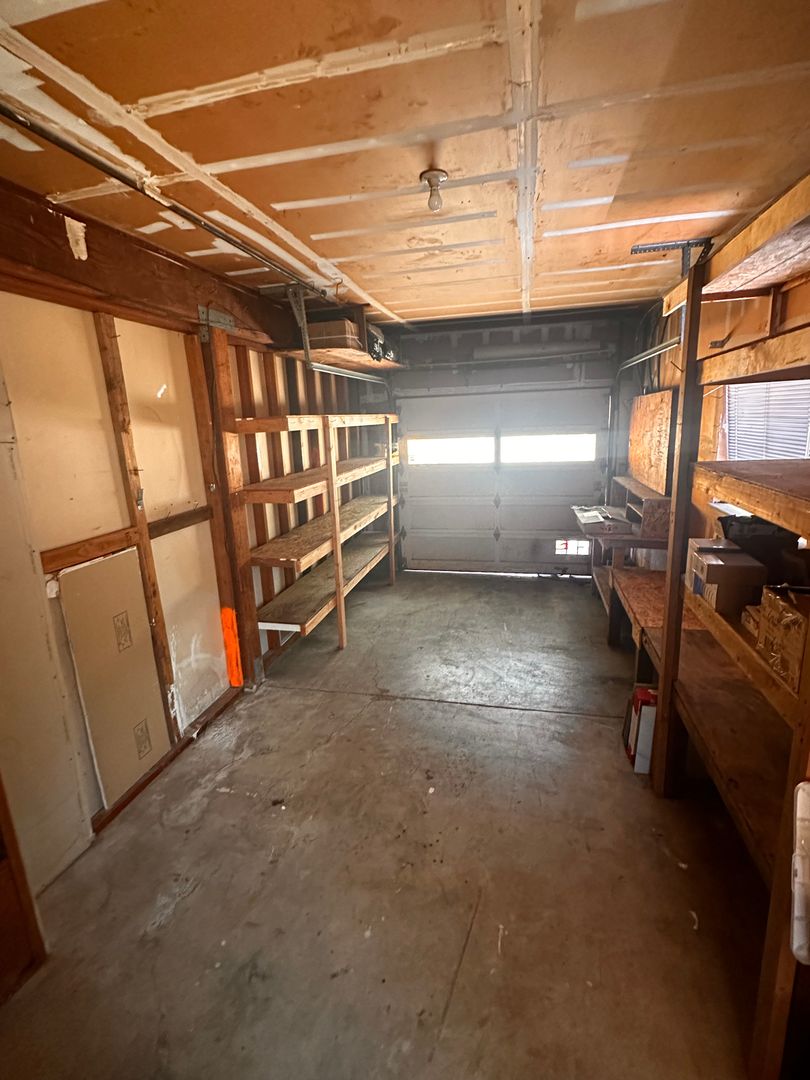 Single car garage with washer and dryer hookups, built-in storage, and space for 1 additional uncovered parking