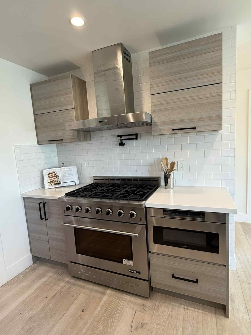 The main level features an open living and dining area with a sleek stone fireplace, hardwood floors, and abundant natural light. A chef’s kitchen showcases quartz countertops, custom cabinetry, and premium appliances including a 6-burner gas range with pot filler. A versatile bedroom suite with views of the East Bay Hills completes this level.