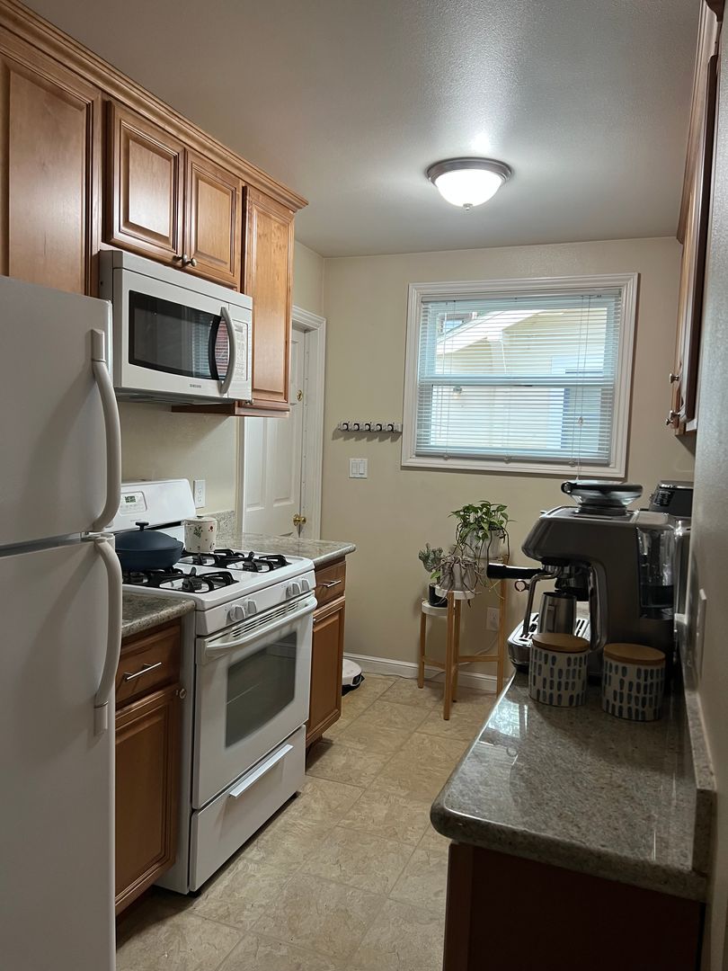 Kitchen complete with granite counter tops, gas stove, built in microwave, dishwasher and refrigerator